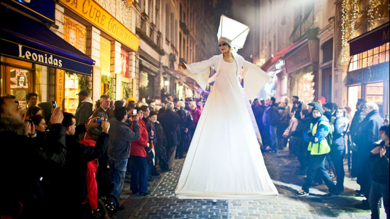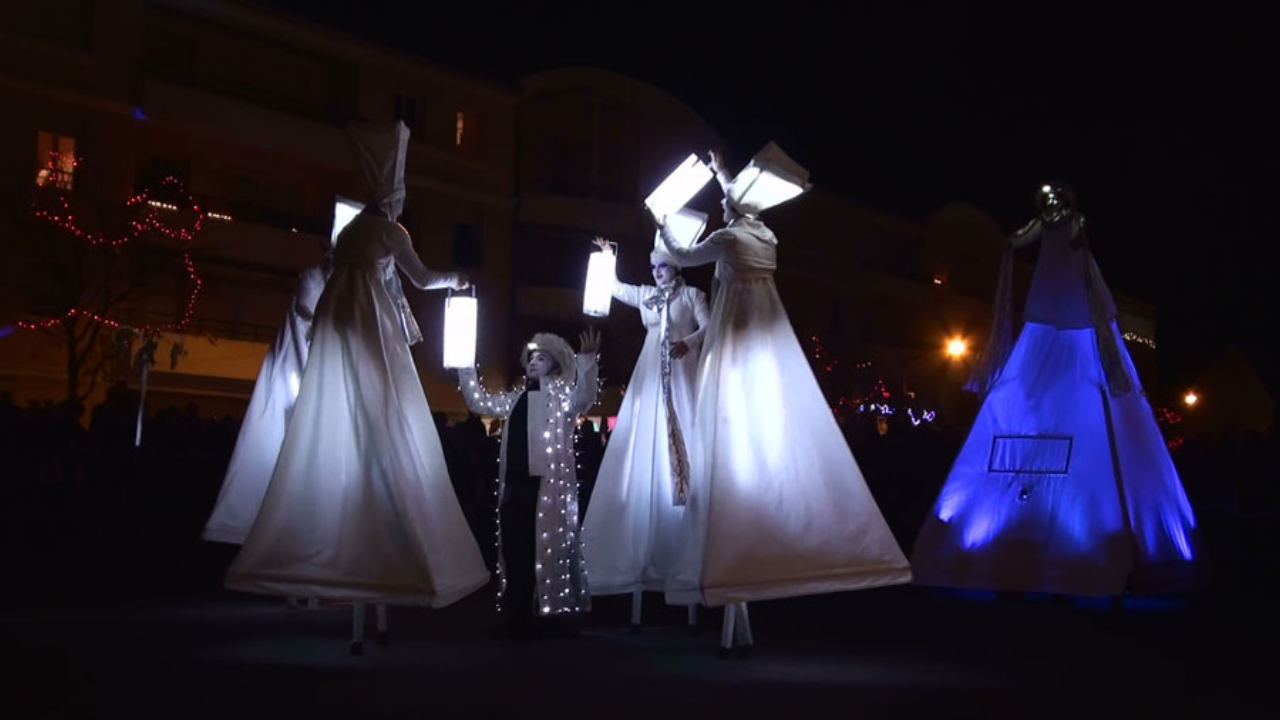 Vêtues de longues robes et hautes coiffes pyramidales blanches et lumineuses. Elles avancent lentement au milieu du public, avec féminité, grâce et fluidité.