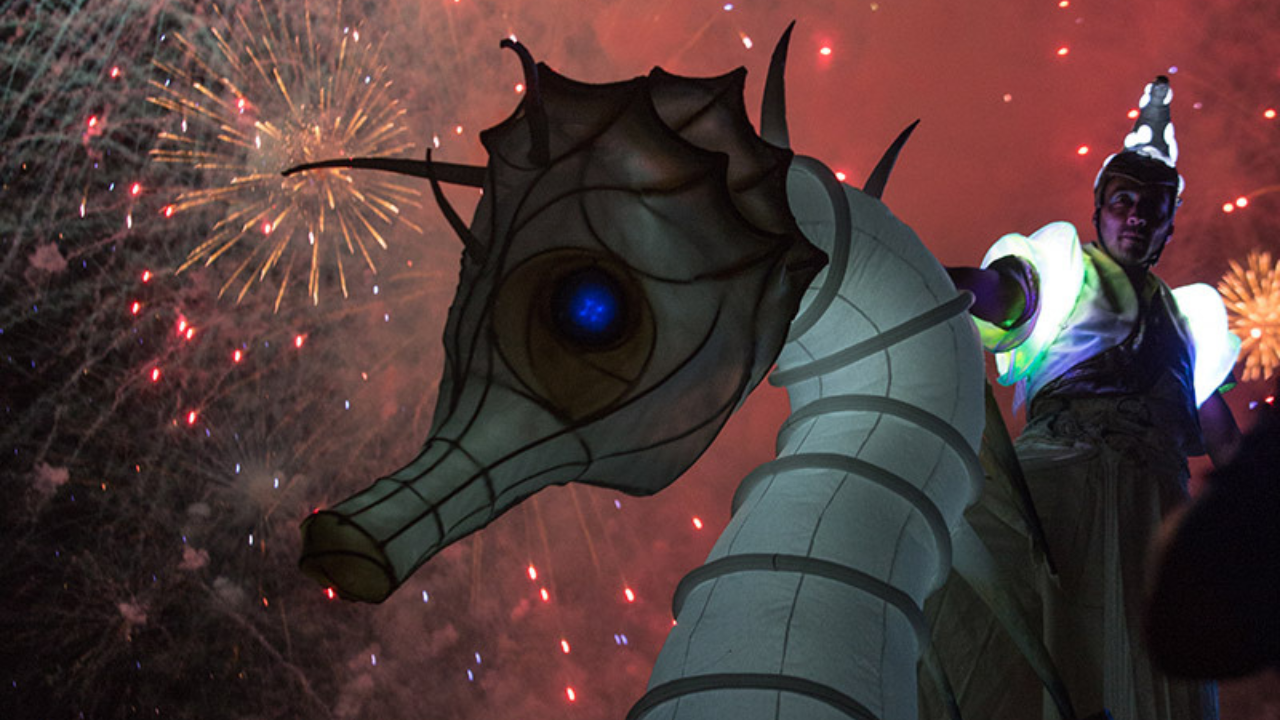 D'une profondeur immense, plongé dans un univers fascinant, qui se perd au dela de nos regards. Un impressionnant cortège lumineux s'avance dans la nuit, portée par les rythmes des Taikos et de sons électro. Une voie lactée de méduses, des astres qui scintillent, un majestueux Hippocampe, accompagné d'échassiers.